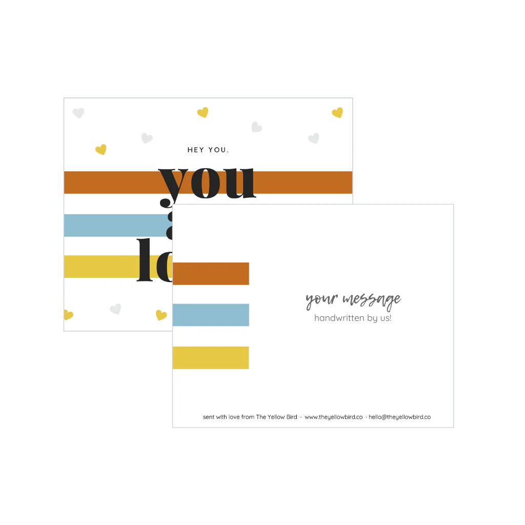 Add a card to your cart and include your message in the order notes when checking out. We will handwrite your message and send it with your gift!