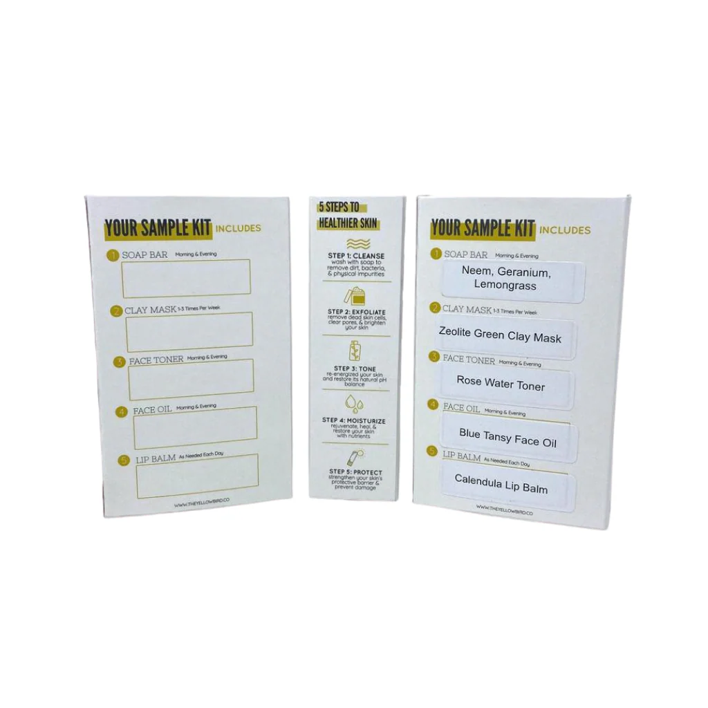 - Our Ingredients: All of the products you select for your sample kit are made without harsh chemicals and are paraben free, fragrance free, GMO free, and handmade in small batches in the USA.